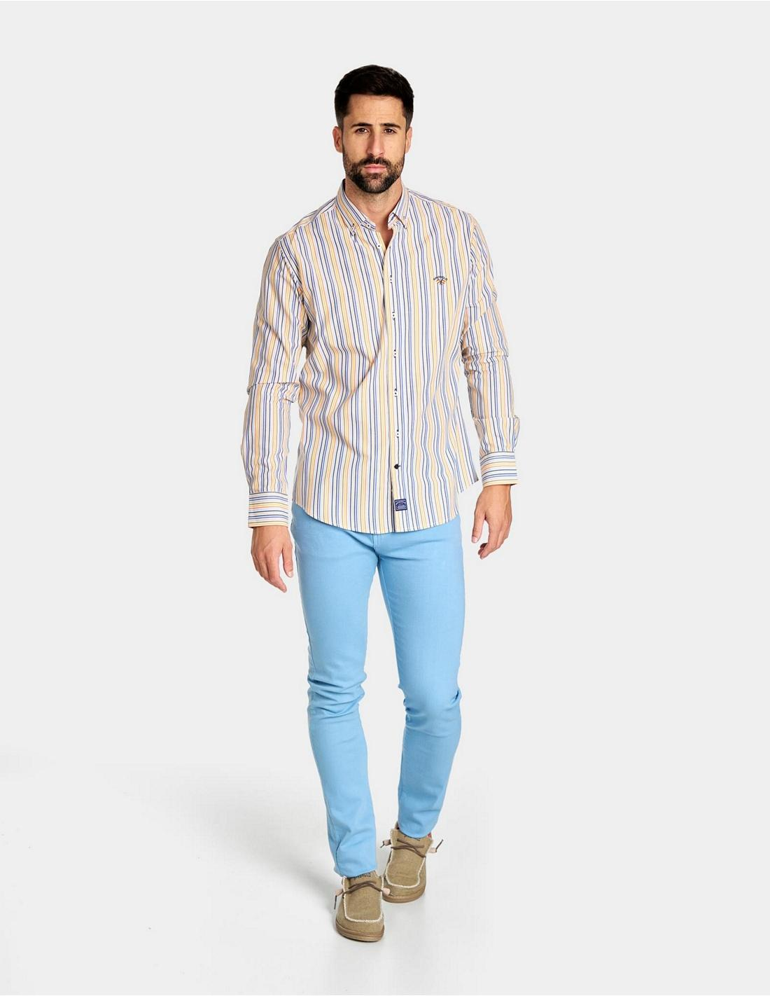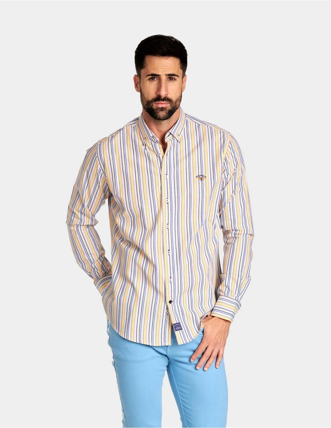 Camisa de hombre confeccionada en tejido popelín de rayas en color amarillo. Cuenta con cuello clásico de botón y puños sencillos. Personalizada con bordado de logo Spagnolo de banderas a contraste en el pecho.