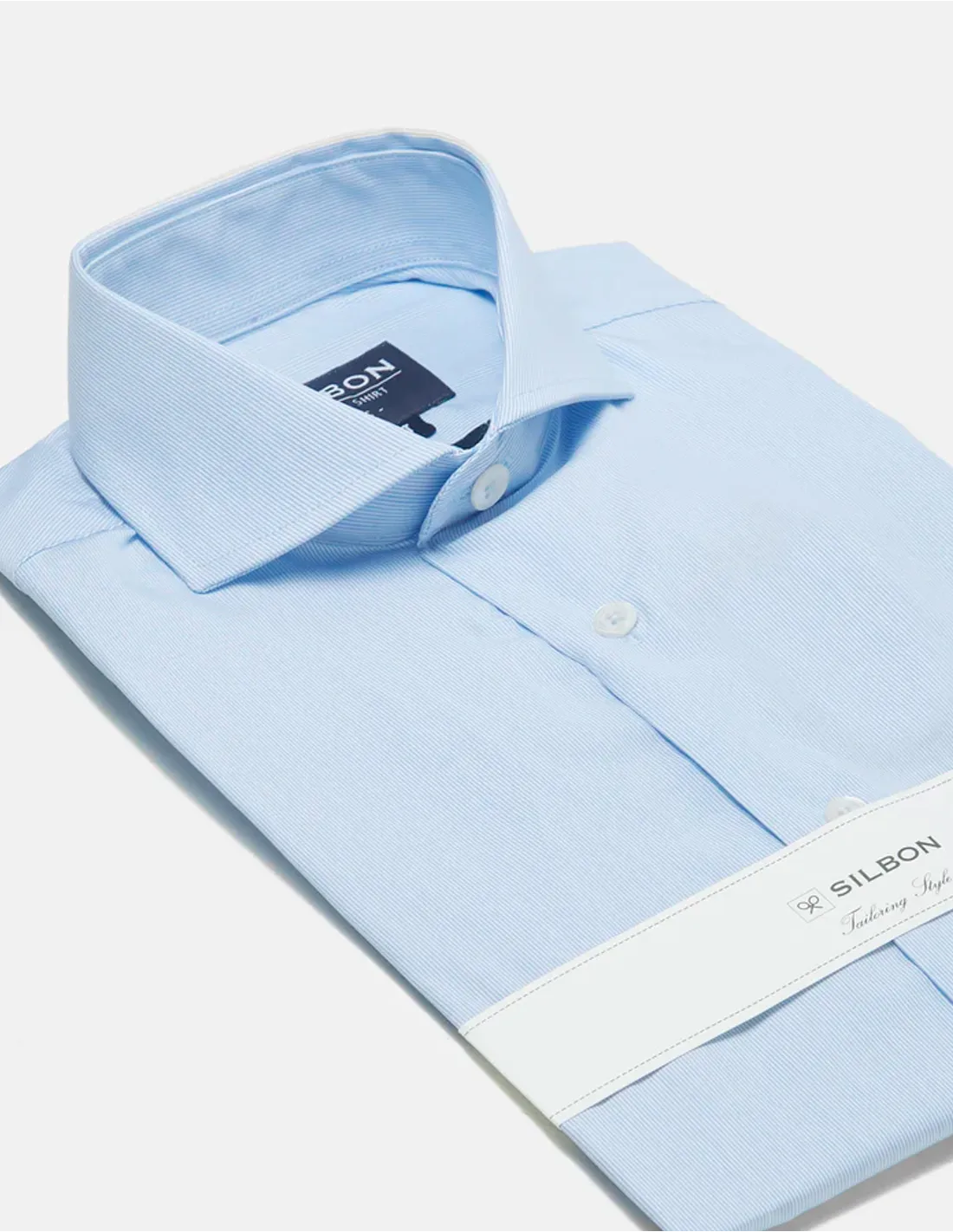 Camisa de vestir Silbon con mini rayas en celeste, confeccionada en algodón de alta calidad. Corte Slim fit y diseño sofisticado para ocasiones formales.
