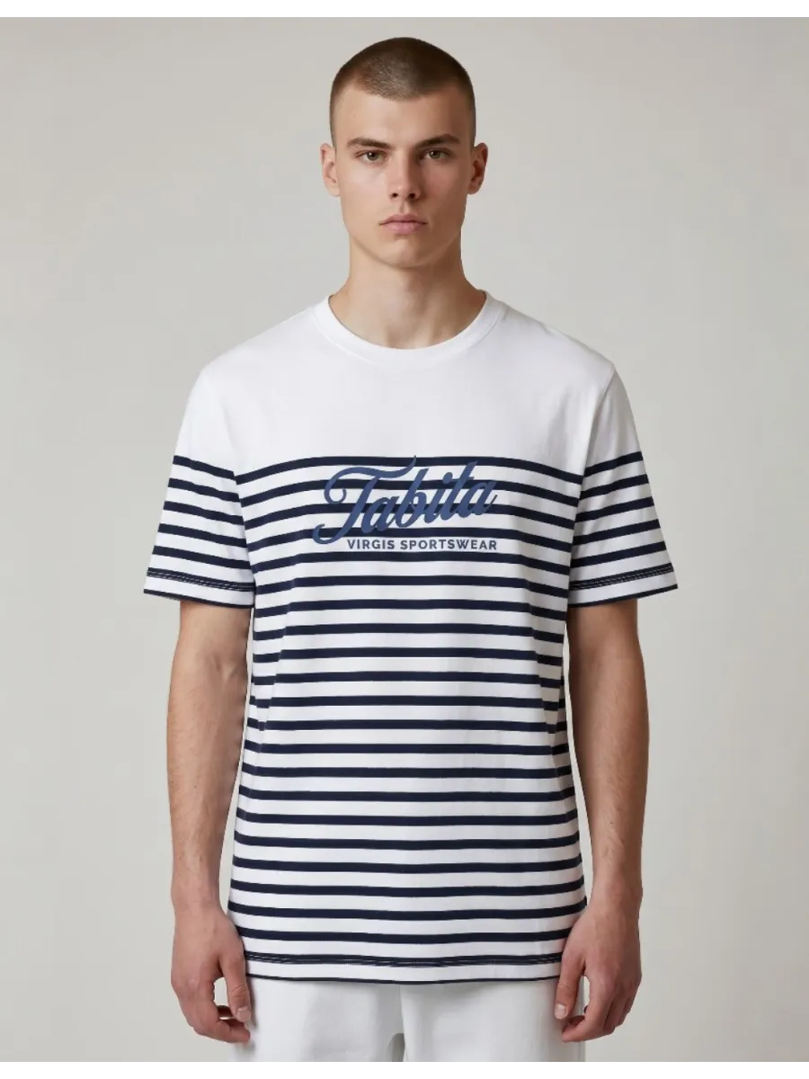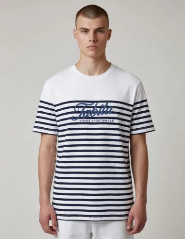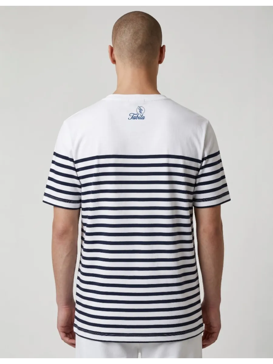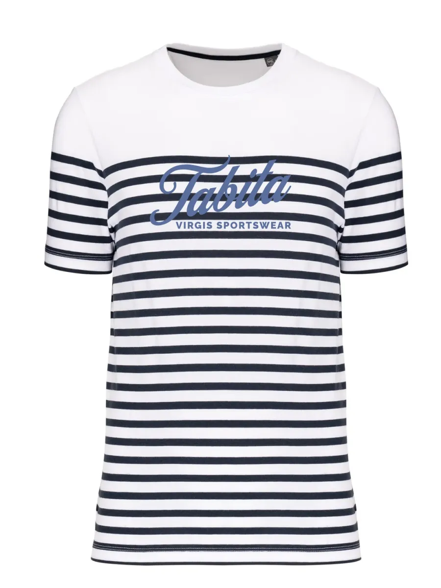 Camiseta Tabita con diseño marinero de rayas Navy Stripes. 100% algodón orgánico GOTS. Corte Medium Fit unisex, un icono de estilo náutico.